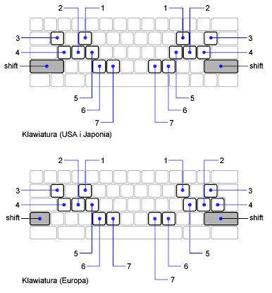 Klawisze na poniższej ilustracji są domyślnymi klawiszami, ale można zmienić ich przypisania i dodać nowe według potrzeb.