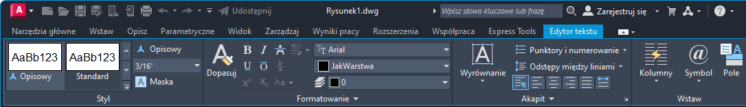Po wybraniu określonego typu obiektu lub rozpoczęciu niektórych poleceń zostanie wyświetlona kontekstowa karta wstążki zamiast paska narzędzi bądź okna dialogowego. Karta kontekstowa jest zamykana po zakończeniu polecenia.