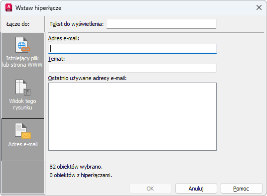 Tworzy listę ostatnio używanych adresów poczty elektronicznej, z których można wybrać jeden dla hiperłącza.