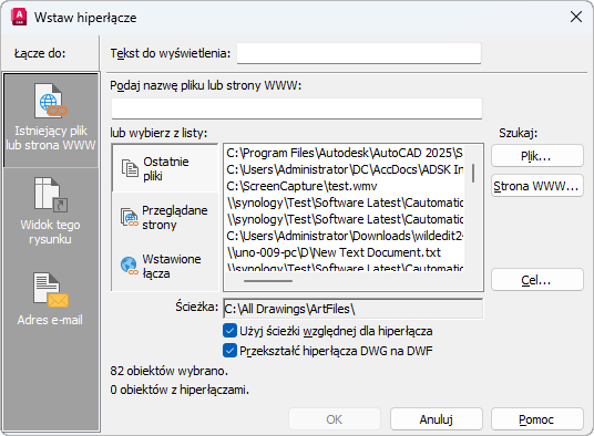 Wyświetla ścieżkę do pliku skojarzonego z hiperłączem. Jeśli wybrano opcję Użyj ścieżki względnej dla hiperłącza, na liście pojawia się tylko nazwa pliku. Jeżeli nie wybrano opcji Użyj ścieżki względnej dla hiperłącza, wyświetlana jest pełna ścieżka oraz nazwa pliku.