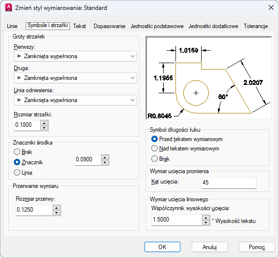 Ustala sposób wyświetlania symbolu długości łuku na wymiarze długości łuku. (DIMARCSYM — zmienna systemowa)