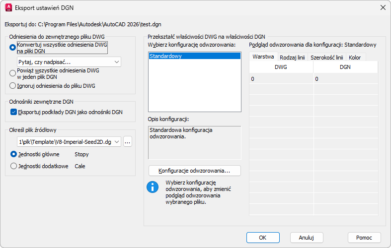 Wyświetla listę wszystkich właściwości eksportowanego pliku DWG (w kolumnie DWG) i wybranej konfiguracji odwzorowania (w kolumnie DGN).