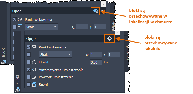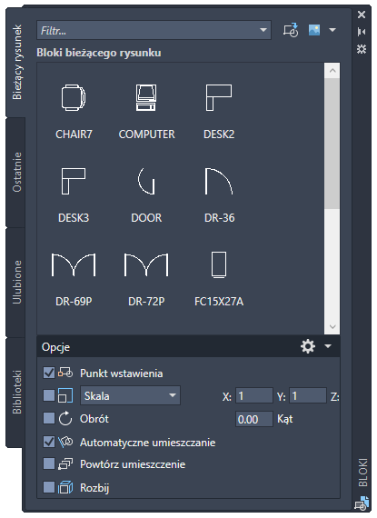 Wskazówka: Można tworzyć „rysunki biblioteki bloków”, które zawierają wszystkie powiązane definicje bloków. W przypadku używania tej metody należy podczas wstawiania rysunku biblioteki bloków wybrać opcję palety Rozbij, aby zapobiec wyświetlaniu lub wyszczególnianiu samego rysunku w obszarze podglądu.