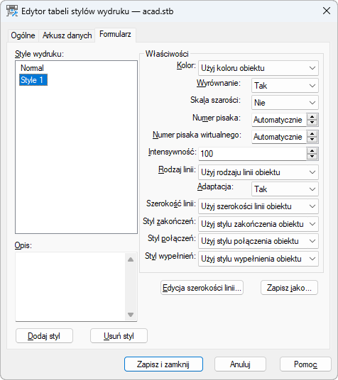 W przypadku przypisania szerokości linii stylu wydruku zastąpi ona szerokość linii obiektu podczas wydruku.