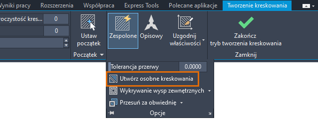 Domyślnie wstawienie kreskowania do wielu obszarów w ramach jednego polecenia powoduje powstanie pojedynczego obiektu kreskowania. W razie potrzeby zmiany właściwości jednego obszaru lub usunięcia obszaru konieczne jest rozdzielenie obiektów kreskowania.