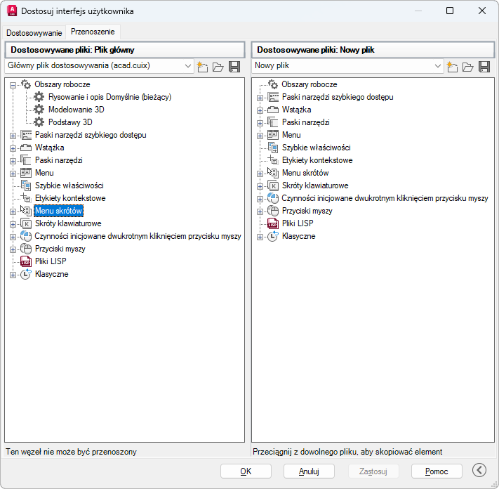 Po wprowadzeniu w wierszu polecenia wyrażenia IMPORTCUI w prawym panelu zostanie wyświetlony główny plik CUIx (domyślnie acad.cuix dla plików programu AutoCAD lub acadlt.cuix dla plików programu AutoCAD LT). Aby przenieść dane, należy w lewym panelu otworzyć plik CUIx lub starszy plik dostosowywania. Po wprowadzeniu w wierszu polecenia wyrażenia EKSPORTCUI w lewym panelu zostanie wyświetlony główny plik CUIx. Aby przenieść dane, należy w prawym panelu otworzyć plik CUIx lub plik dostosowywania starszego typu.