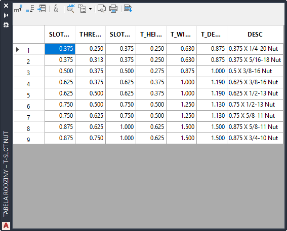 Tabela rodziny jest bazą danych zawierającą poprawne wartości parametrów definiujących każdy element należący do rodziny. Każdy wiersz określa unikalny element należący do rodziny części/elementów.