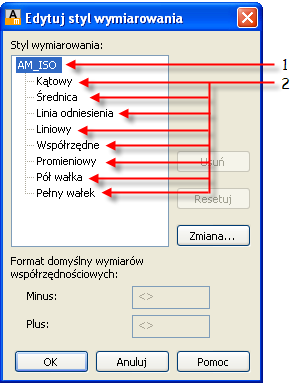 Style wymiarowania skojarzone ze standardem kreślarskim składają się z bazowego stylu wymiarowania (pozycja 1 na ilustracji), który definiuje podstawowe ustawienia wymiarów w tej normie, oraz podstylów (pozycja 2 na ilustracji), które jawnie definiują różne typy wymiarowania. W większości przypadków style podrzędne są takie same jak styl bazowy. W niektórych sytuacjach, gdy trzeba wymusić unikatową charakterystykę typu wymiarowania, ustawienia domyślne danego stylu wymiarowania mają co najmniej jedno ustawienie, które jest inne niż ustawienie bazowego stylu wymiarowania.