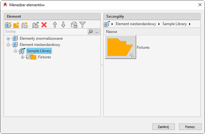 na pasku narzędzi. Podczas tworzenia biblioteki należy określić nazwę pliku i położenie biblioteki zawartości. Program Zestaw narzędzi AutoCAD Mechanical dodaje nową bibliotekę do drzewa po lewej stronie, bezpośrednio poniżej węzła Element niestandardowy. Następnie można utworzyć foldery organizujące i kategoryzujące zawartość, na przykład biblioteki zawartości standardowej. Dostęp do często używanych elementów można ułatwić przez przeniesienie folderów w górę drzewa.