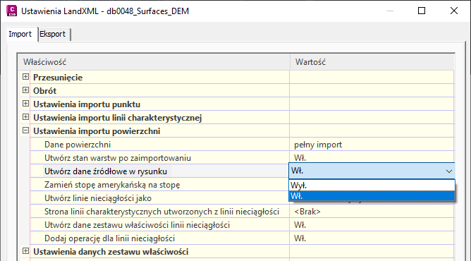 Rysunek 2: Ustawienia importu powierzchni LandXML