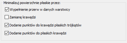 Podczas dodawania warstwic do definicji powierzchni okno dialogowe Dodaj dane warstwic zawiera ustawienia domyślne minimalizowania powierzchni płaskich, jak pokazano na rysunku 6.
