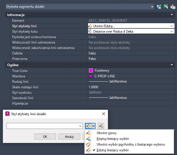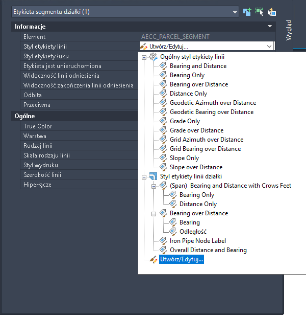 Z menu rozwijanego stylów na palecie Właściwości wybierz polecenie Utwórz/Edytuj (jak pokazano na rysunku 13), aby uzyskać dostęp do okna dialogowego Styl etykiety linii działki, jak pokazano na rysunku 14.