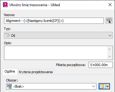 W przypadku tworzenia linii trasowania za pomocą okna dialogowego Utwórz linię trasowania — Układ lub Utwórz linię trasowania — Z polilinii domyślnie tworzona jest linia trasowania bez określonego obszaru — w polu obszaru wyświetlane jest ustawienie <Brak>, jak pokazano na rysunku 2.