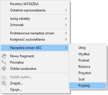 Przed dodaniem danych polilinii warstwicy do powierzchni należy sprawdzić, czy obejmuje ona jakiś teren, który nie jest potrzebny do celów projektowych. Jeśli tak, można skorzystać z narzędzi zmian AEC, aby wyciąć niepotrzebne części warstwic. Jak pokazano na rysunku 5, narzędzia te są dostępne w menu prawego przycisku myszy, kiedy w rysunku nie jest wybrany żaden obiekt.