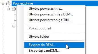 Program Autodesk Civil 3D umożliwia eksportowanie plików DEM z powierzchni. Podczas eksportu można rozszerzyć odstęp siatki, aby zmniejszyć plik. Na rysunku 3 pokazano wybór opcji menu używanej do rozpoczęcia procesu eksportu.