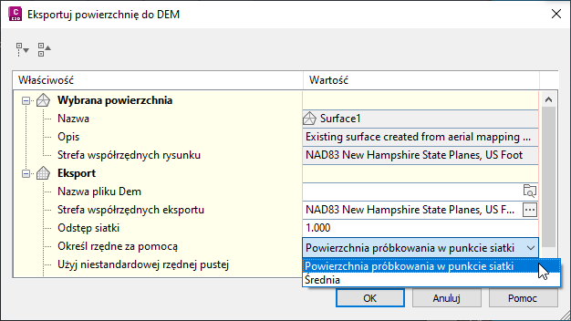 Ważnym ustawieniem eksportu jest metoda określania rzędnej dla każdego punktu. Użytkownik może wybrać próbkowanie rzędnych powierzchni w punkcie siatki lub obliczenie średniej rzędnej z punktów otaczających. Druga metoda (uśrednianie) jest bardziej czasochłonna. Aby uzyskać lepszą wydajność, należy użyć opcji próbkowania powierzchni, jak pokazano na rysunku 4.