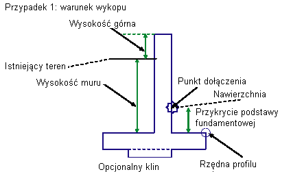 | Przykrycie podstawy fundamentowej | Głębokość przykrycia od szczytu podstawy do linii nachylenia końcowego po stronie tylnej muru w nasypie lub do punktu wyjściowego w wykopie. | Liczbowy |
