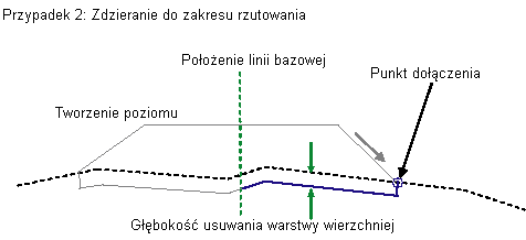 Jeśli wybrana została opcja wydłużania połączenia zdzierania do powierzchni, najpierw wstawiane jest połączenie skarpy wewnętrznej o zadanym nachyleniu sięgającej do głębokości zdzierania, a następnie dodawane jest połączenie poziome, tak jak opisano to wcześniej. Ponadto dodawane jest połączenie skarpy zewnętrznej w kierunku zewnętrznym, od zewnętrznego najniższego punktu połączenia zdzierania, z zadaną skarpą wewnętrzną, sięgające do rzędnej punktu dołączenia podzespołu.