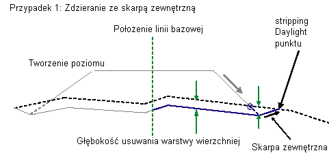 Ten podzespół powoduje wstawienie równoległych połączeń definiujących spód warstwy zdzierania pod określoną powierzchnią. Jeśli opcja wydłużania obszaru zdzierania zboczem do istniejącego gruntu jest ustawiona na Nie, to zdzieranie rozpoczyna się w punkcie dołączenia bezpośrednio na określonej powierzchni i wstawiane jest połączenie pionowe o głębokości określonej parametrami wejściowymi. Od dołu tego połączenia pionowego wstawianych jest, w kierunku do wewnątrz, szereg połączeń równoległych do określonej powierzchni. Szereg ten sięga aż do lokalizacji linii bazowej podzespołu. Jeśli opcja wydłużania obszaru zdzierania do istniejącego gruntu jest ustawiona na Tak, w punkcie dołączenia wstawiane jest połączenie z określoną skarpą wewnętrzną, tak aby różnica między rzędną najniższego punktu tego nowego połączenia a określonym istniejącym gruntem była równa „głębokości zdzierania”. Od dołu tego punktu wstawianych jest, w kierunku do wewnątrz, szereg połączeń równoległych do określonej powierzchni. Szereg ten sięga aż do lokalizacji linii bazowej podzespołu. Ponadto dodawane jest połączenie w kierunku zewnętrznym w celu rzutowania na istniejący grunt.