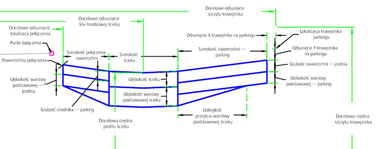 | Odsunięcie szczytu krawężnika | Służy do określania rzędnej szczytu krawężnika położenia wiązania krawężnika parkingu. Następujące typy obiektów można zastosować jako obiekty docelowe do określania rzędnej: profile, polilinie 3D, linie charakterystyczne lub figury pomiarowe. | Wymagany |