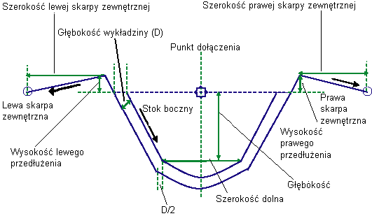 | Głębokość | Pionowe odsunięcie w dół, od rzędnej linii nachylenia profilu do dna kanału. | Liczbowy, dodatni |