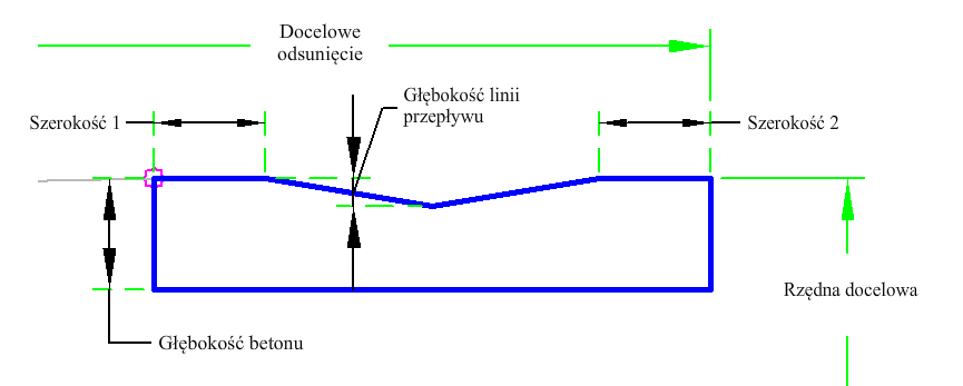 Może służyć do zastąpienia głębokości linii przepływu i łączenia rzędnej wysokości linii przepływu z rzędną wysokości profilu. Następujące typy obiektów można zastosować jako obiekty docelowe do określania tej rzędnej: profile, polilinie 3D, linie charakterystyczne lub figury pomiarowe. | Opcja |