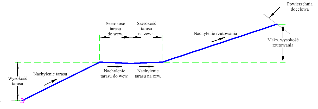 Początkowy punkt zawiasu ustawiany jest w punkcie dołączenia. Rzędna punktu zawiasu sprawdzana jest w stosunku do powierzchni docelowej w celu określenia, czy sekcja znajduje się w warunku wykopu czy nasypu. Przecięcie z powierzchnią docelową obliczane jest przy użyciu podanego nachylenia rzutu. Jeśli wysokość do przecięcia przekracza wysokość maksymalną rzutu, wstawiane jest połączenie z użyciem wysokości tarasu i dodawany jest taras. Punkt zawiasowy jest resetowany do zewnętrznej krawędzi tarasu i proces jest powtarzany aż do zlokalizowania połączenia rzutowania nieprzekraczającego wysokości maksymalnej rzutowania.