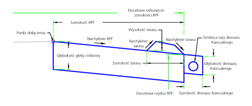 | Rzędna RPF | Może posłużyć do zastąpienia roślinnego pasa filtracyjnego i połączenia rzędnej z rzędną profilu. Następujące typy obiektów można zastosować jako obiekty docelowe do określania rzędnej: profile, polilinie 3D, linie charakterystyczne lub figury pomiarowe. | Opcja |