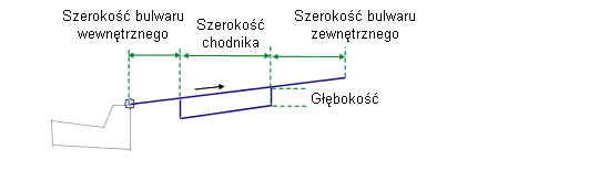 Przy danym nachyleniu połączenia chodnika oraz wewnętrznego i zewnętrznego pasa trawnika są wstawiane na zewnątrz od punktu dołączenia. Można pominąć pasy trawnika poprzez ustawienie ich zerowej szerokości.