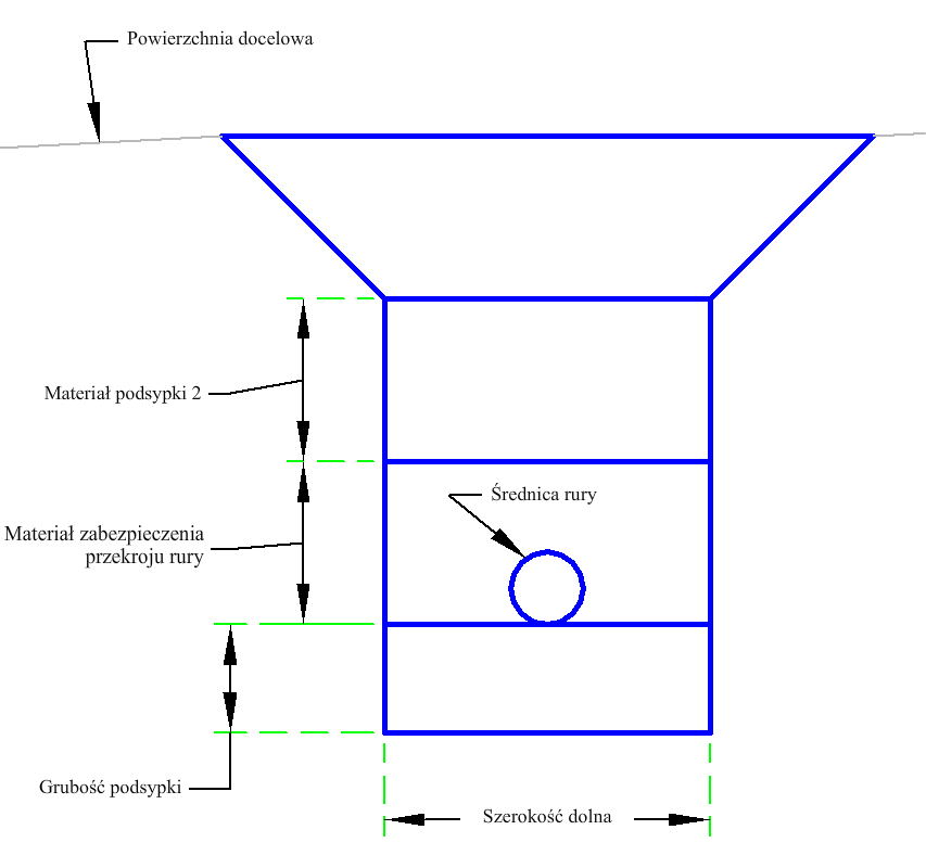 | Grubość podsypki | Głębokość podsypki rury pod dół rury. | Liczbowy, dodatni |