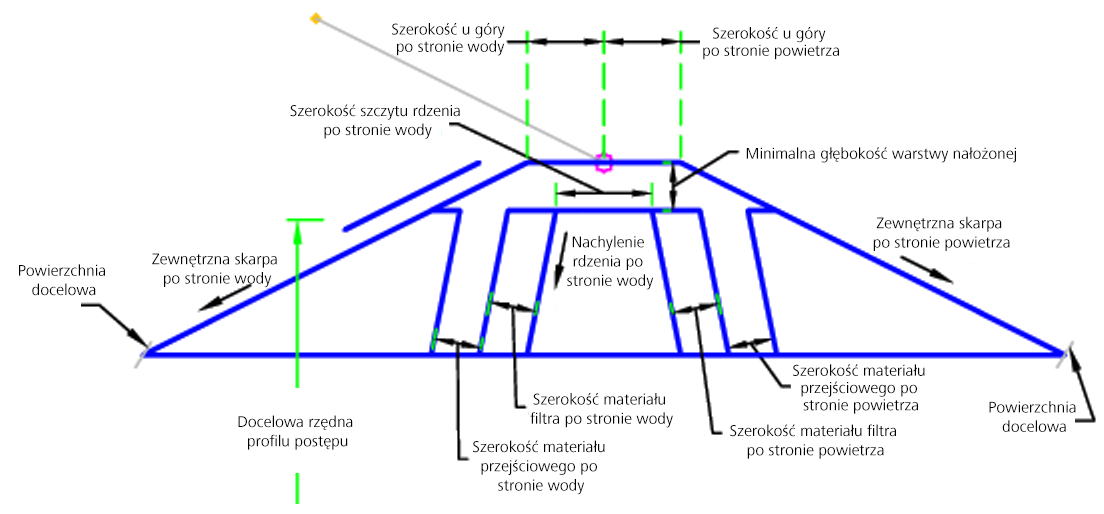 | Profil postępu | Może służyć do pokazania postępu tamy na podstawie rzędnej docelowej. Następujące typy obiektów można zastosować jako obiekty docelowe do określania rzędnej: profile, polilinie 3D, linie charakterystyczne lub figury pomiarowe. | Opcja |