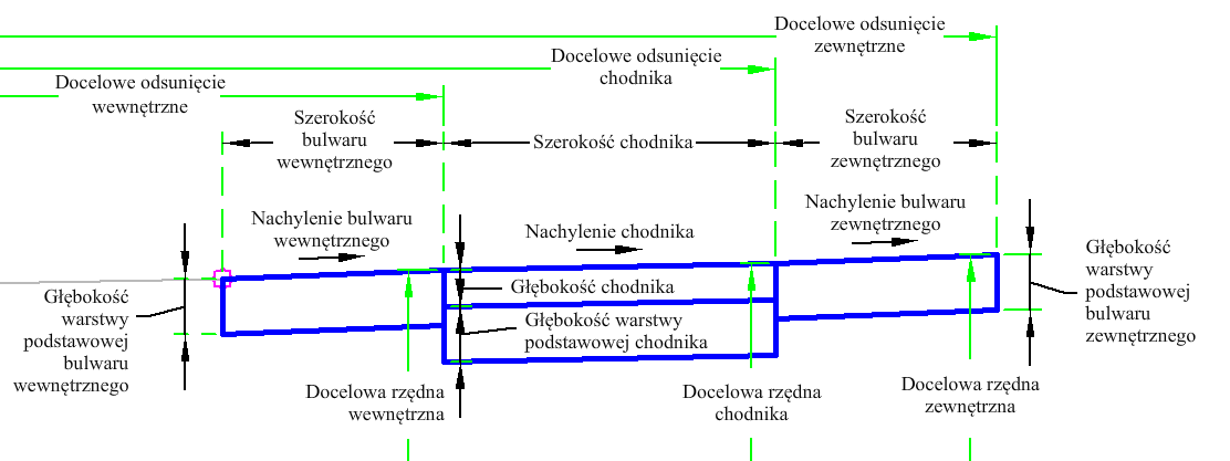 | Szerokość bulwaru wewnętrznego | Można używać w celu zastąpienia stałej wartości Szerokość bulwaru wewnętrznego i połączenia wewnętrznej krawędzi chodnika z linią trasowania odsunięcia. Następujące typy obiektów można zastosować jako obiekty docelowe do określania tego odsunięcia: linie trasowania, polilinie, linie charakterystyczne lub figury pomiarowe. | Opcja |