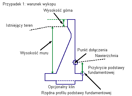 W nasypie nachylona powierzchnia muru jest zwrócona do środka jezdni. W wykopie nachylona powierzchnia jest zwrócona od jezdni, w stronę podtrzymywanej masy ziemnej. Jeśli opcja Klin jest ustawiona na Nie, dolna krawędź podstawy jest pojedynczym poziomym połączeniem. Jeśli opcja Klin jest włączona, tworzone są połączenia definiujące opcjonalne zakotwienie.