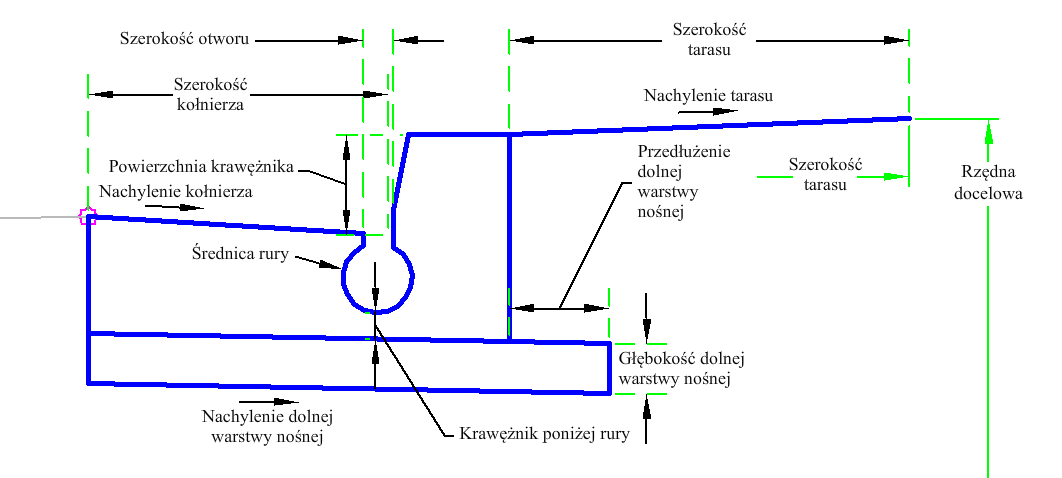 W trybie układu podzespół wyświetla krawężnik, koryto ściekowe i taras.
