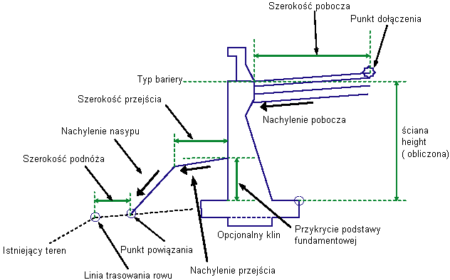 | Krawędź pobocza | Można używać do zastąpienia nachylenia pobocza i powiązania z profilem. Następujące typy obiektów można zastosować jako obiekty docelowe do określania tej rzędnej: profile, polilinie 3D, linie charakterystyczne lub figury pomiarowe. | Opcja |