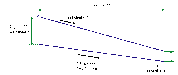 Nachylenie końcowe kształtu wstawiane jest w celu uzyskania zadanej szerokości i % nachylenia po stronie zewnętrznej względem punktu dołączenia. Nachylenie połączenia dolnego obliczane jest na podstawie wewnętrznej i zewnętrznej głębokości kształtu. Kody punktu, połączenia i kształtu są określane na podstawie parametrów wejściowych, będących ciągami zdefiniowanymi przez użytkownika.
