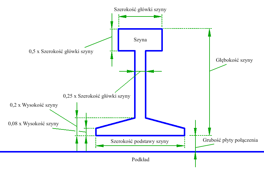 | Głębokość szyny | Głębokość od góry szyny do góry płyty podkładu | Liczbowy, nieujemny |