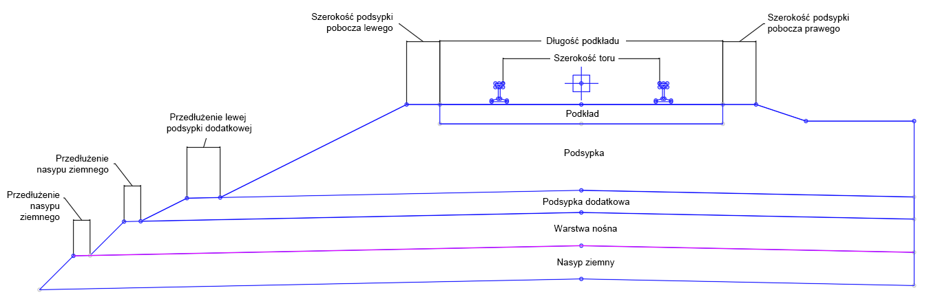 Wartość minimalnej głębokości podsypki jest stosowana w położeniu minimalnego prześwitu pomiędzy podkładem a podsypką dodatkową. Parametr Skos górny podsypki dodatkowej niezależnie steruje skosem górnym podsypki dodatkowej. Parametr Linia bazowa do korony podsypki dodatkowej steruje położeniem korony podsypki dodatkowej.