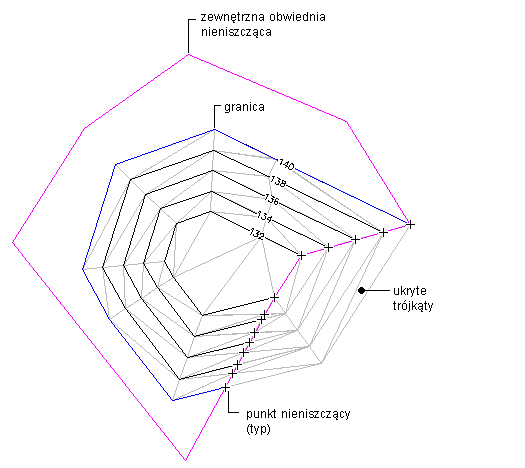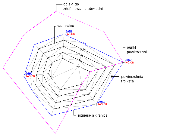 Konstruowanie obwiedni rozpoczyna się od zaznaczenia wieloboków znajdujących się na rysunku. W definicji powierzchni będzie wyświetlany liczbowy identyfikator oraz lista wierzchołków każdej obwiedni.