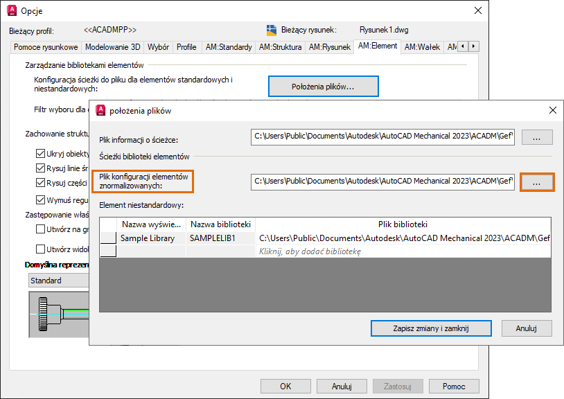 Wszystkie biblioteki elementów znormalizowanych są instalowane z programem AutoCAD Mechanical podczas instalacji jednostanowiskowej. Jeśli nie chcesz, aby wszystkie elementy znormalizowane były wyświetlane w bibliotece elementów, możesz usunąć biblioteki po instalacji: