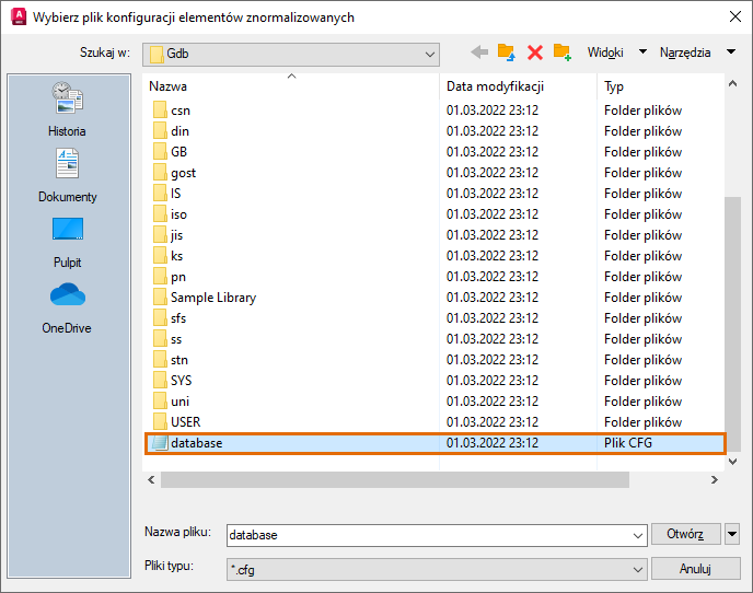 Wybierz przycisk Przeglądaj w polu „Plik konfiguracji elementów znormalizowanych”. Ta ścieżka wskazuje plik konfiguracji (database.cfg) w folderze Gdb.