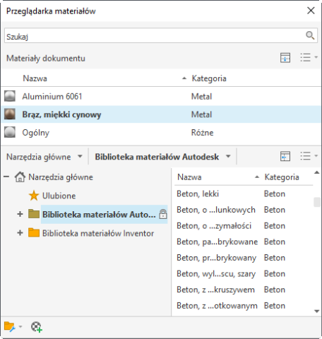 Do definicji materiałów przypisano wiele aspektów. Program Inventor używa dwóch: Wyglądu i Fizyczne. Każdy z nich ma określone właściwości należące do definicji materiału.