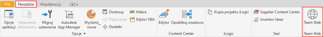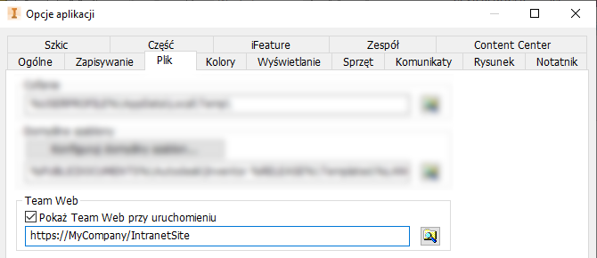 Zaznacz pole wyboru, aby zastąpić ekran początkowy narzędzi głównych programu Inventor określoną stroną Team Web.