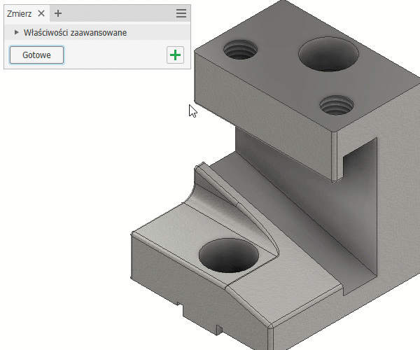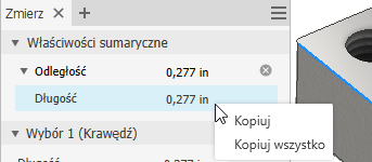 Aby dodać pomiar liniowy, pola powierzchni, objętości, masy i/lub kąta do sekcji Właściwości sumaryczne: dokonaj wyboru w oknie graficznym, a następnie kliknij znak plusa obok typu pomiaru. Wybierz na przykład linię w oknie graficznym, a następnie kliknij znak plusa obok pomiaru. Wartość zostanie dodana do grupy pomiarów Odległość w obszarze Właściwości sumaryczne.