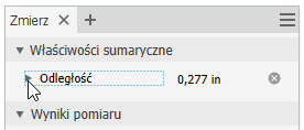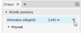 Wybierz wymaganą liczbę elementów w oknie graficznym i kliknij znak plusa obok typu pomiaru w panelu Zmierz, aby dodać wartości do grupy sumarycznej. Wartości są wyświetlane w grupie sumarycznej specyficznej dla typu pomiaru. Przykładowo promień jest dodawany do grupy Odległość, a kąt jest dodawany do grupy Kąt w sekcji Właściwości sumaryczne.