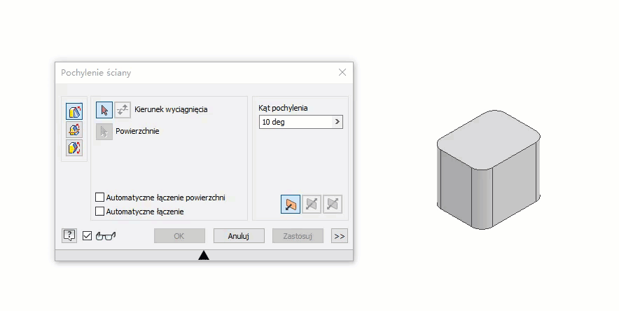. Tworzy pochylenie wokół stałej płaszczyzny. Płaska powierzchnia części lub płaszczyzna konstrukcyjna określa, które z wybranych płaszczyzn zostaną pochylone. W zależności od położenia płaszczyzny zamocowanej, pochylenie może spowodować dodanie lub usunięcie materiału.