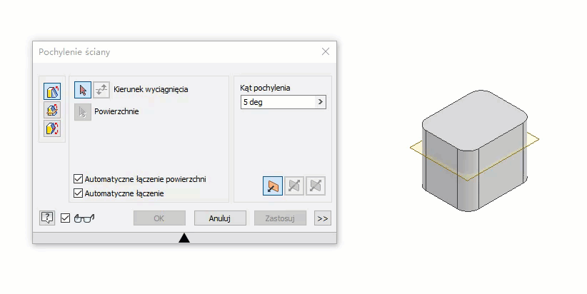 Można utworzyć pochylenie ściany stałej krawędzi lub płaszczyzny albo pochylenie ściany linii podziału.
