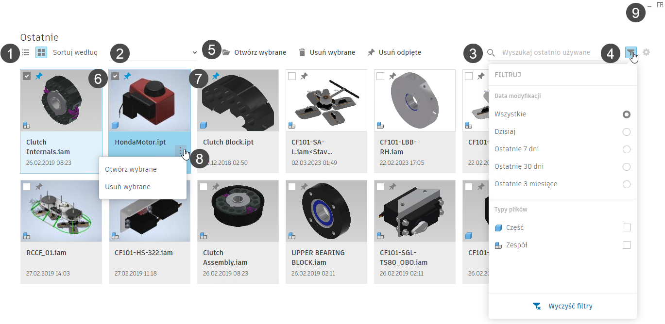 Usuń filtry resetuje wszystkie filtry do ich wartości domyślnych, a wszystkie ostatnio używane pliki są wyświetlane na liście.