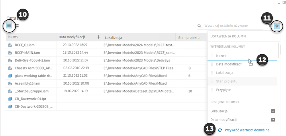 Za pomocą tego panelu można zarządzać ostatnio otwartymi dokumentami. W tym panelu jest również wyświetlany stan plików zarządzanych przez projekt programu Vault.