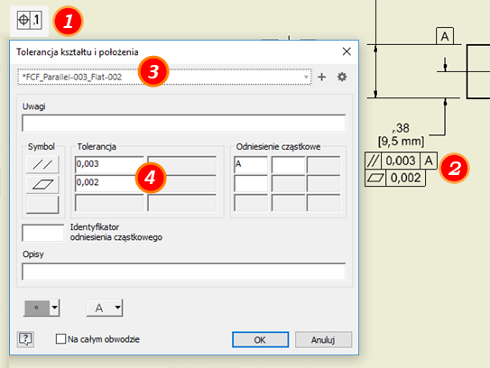 Określ atrybuty i wartości symbolu w oknie dialogowym Tolerancja kształtu i położenia, a następnie kliknij przycisk OK.